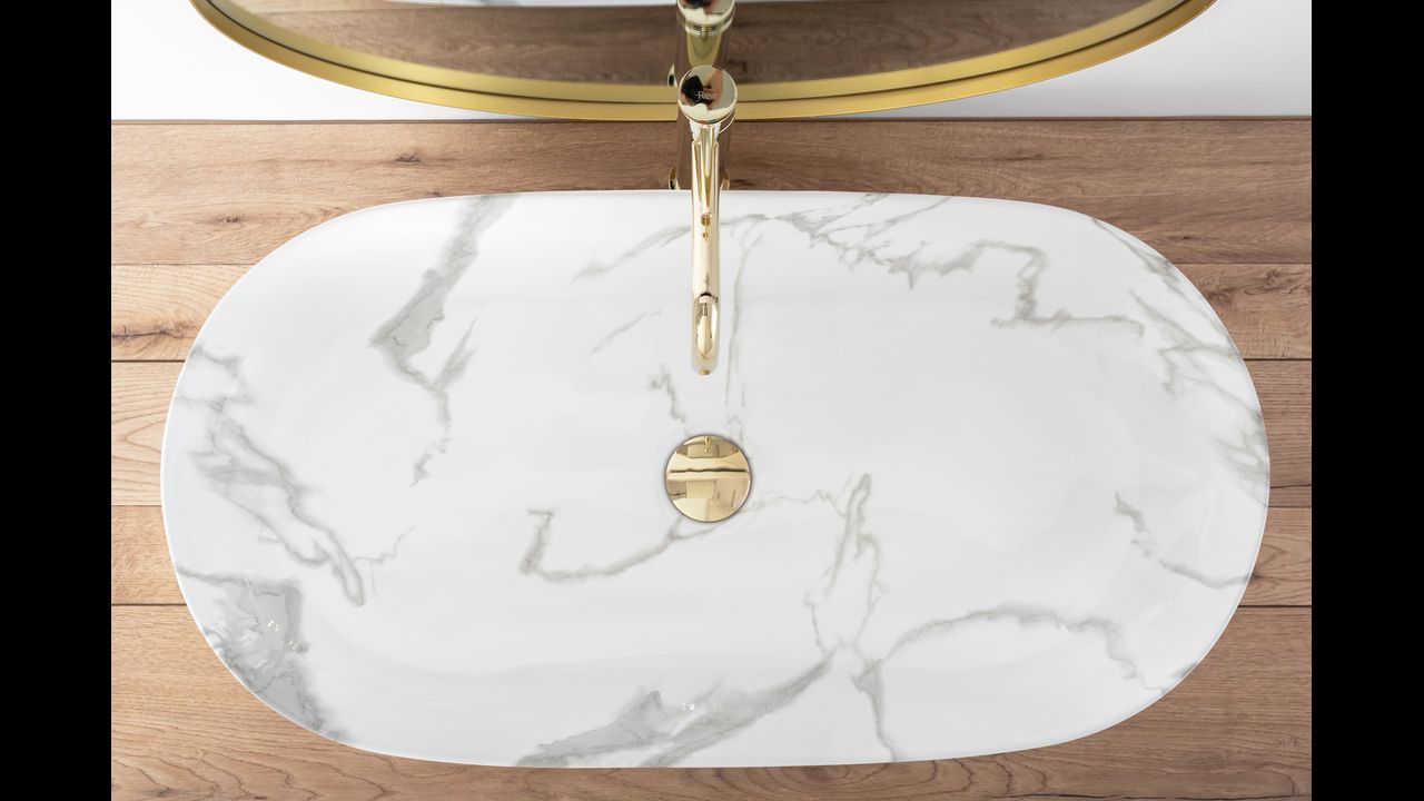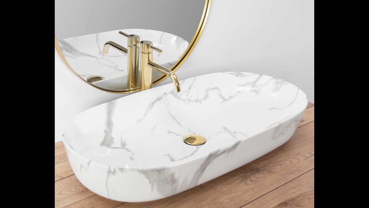Umývadlo v bielom lesklom prevedení s mramorovým efektom sa navyše vďaka špeciálnej fáze výroby ľahko čistí, je veľmi odolné a má svoj jedinečný vzor.