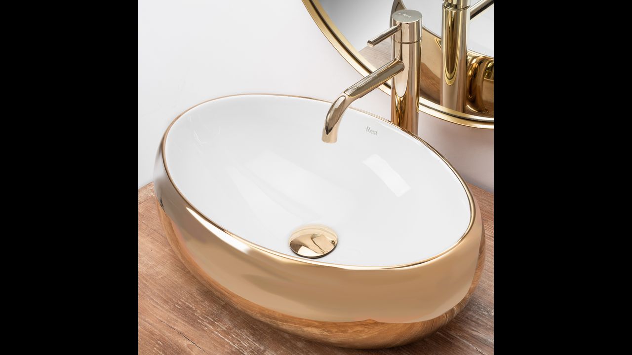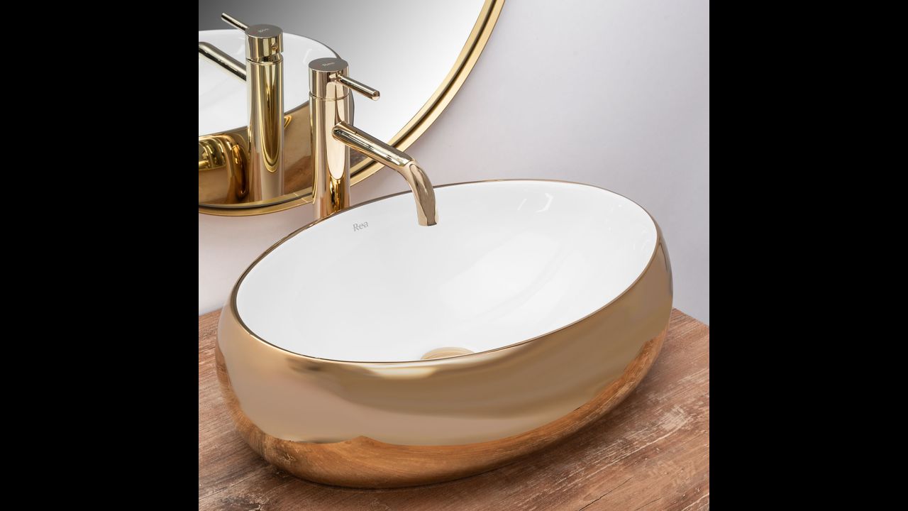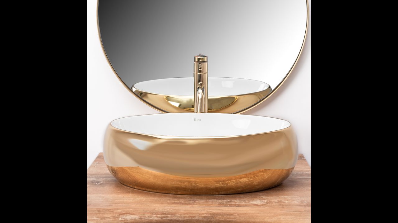 Umývadlo v bielom lesklom prevedení na vnútornej strane a zlatom prevedení na vonkajšej strane sa navyše vďaka špeciálnej fáze výroby ľahko čistí a je veľmi odolné. Táto povrchová úprava taktiež dáva umývadlám jedinečný kamenný vzor.