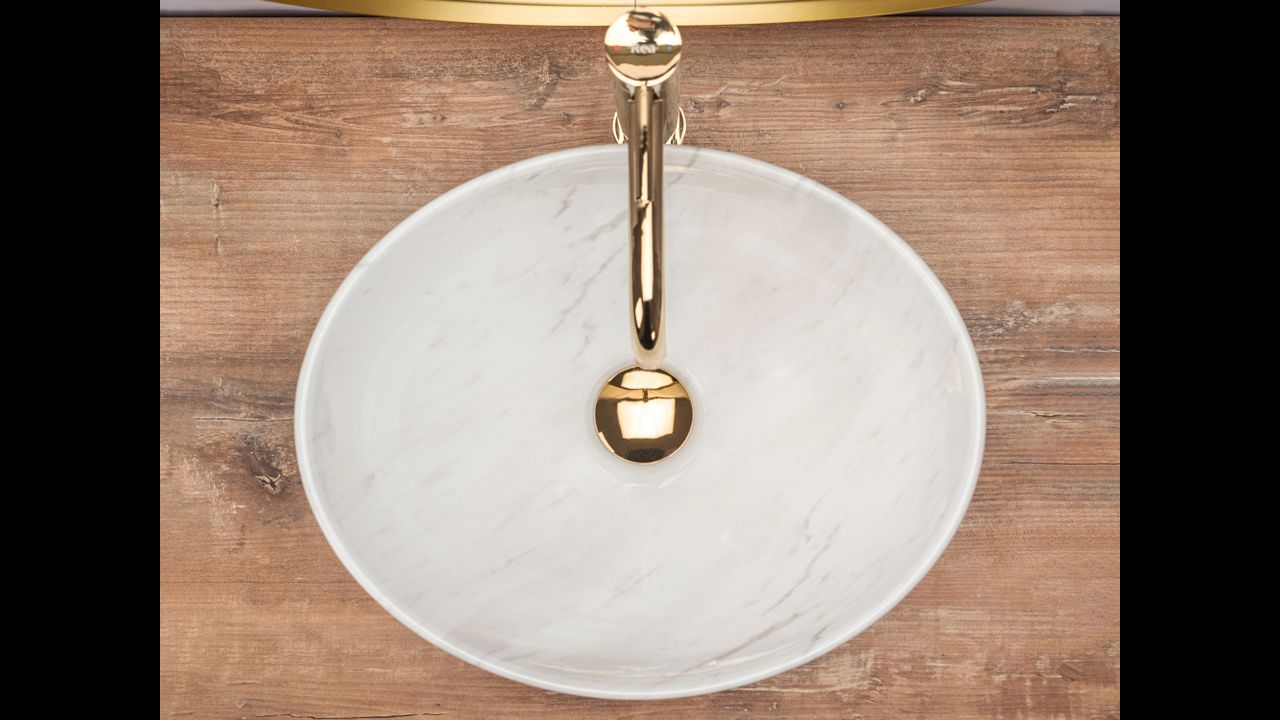 Umývadlo v bielom lesklom prevedení s mramorovým nádychom sa navyše vďaka špeciálnej fáze výroby ľahko čistí a je veľmi odolné. Špeciálna povrchová úprava dáva umývadlám jedinečný mramorový vzor.