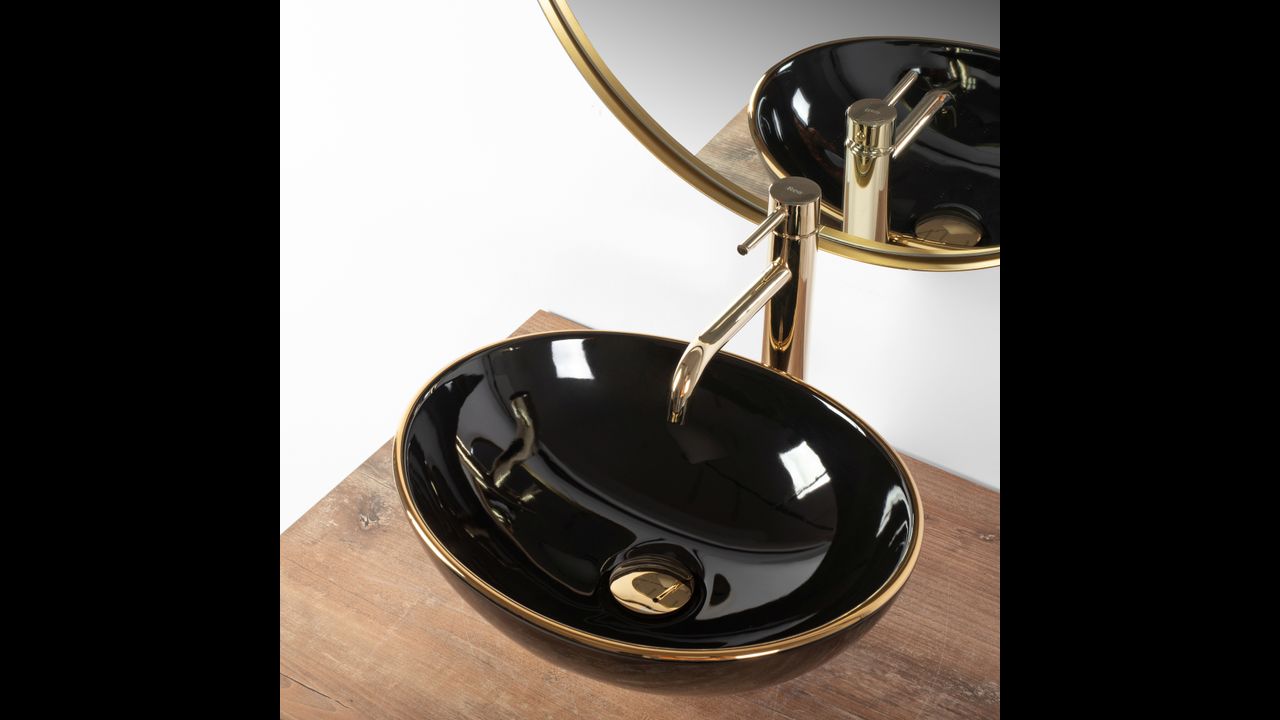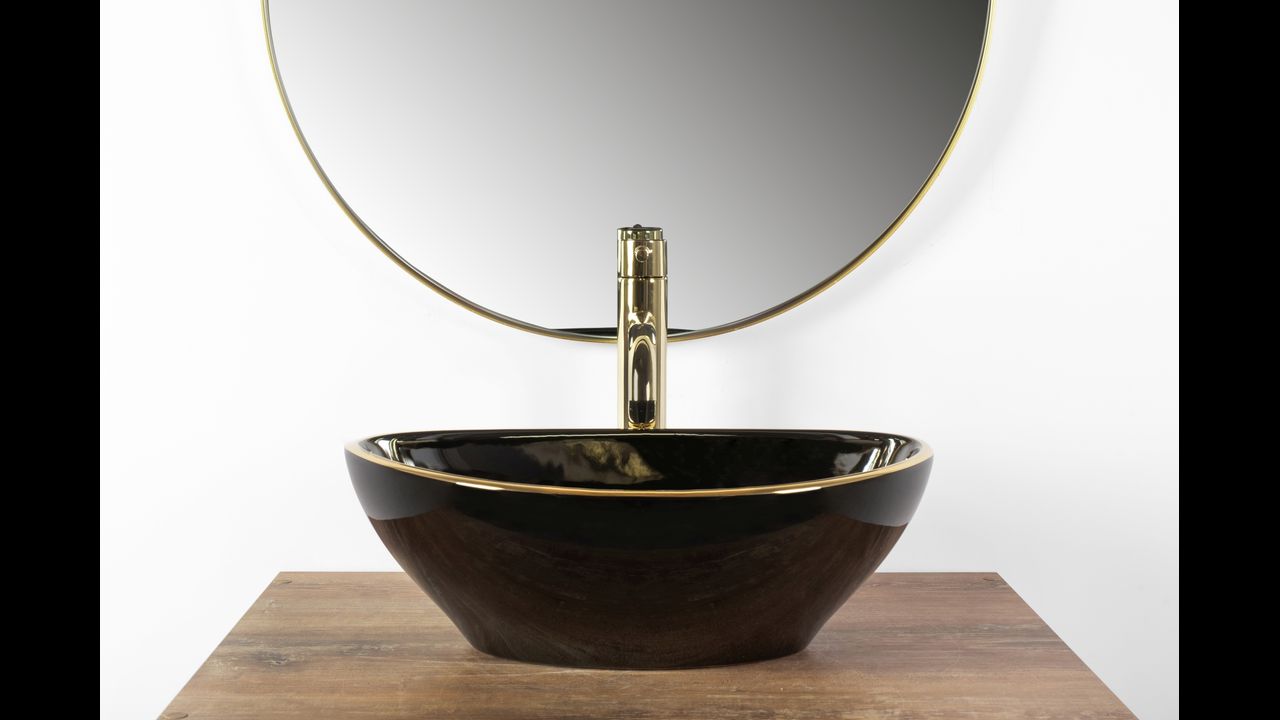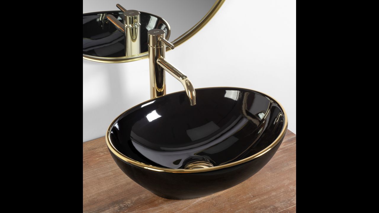 Umývadlo v čiernom lesklom prevedení pozláteným okrajom sa navyše vďaka špeciálnej fáze výroby ľahko čistí a je veľmi odolné.