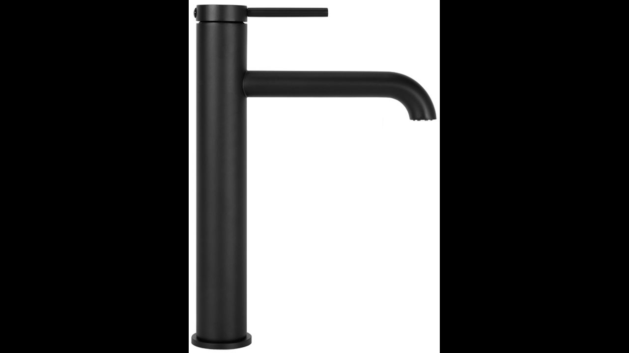 Moderná vysoká umývadlová batéria série Rea Spot je vyrobená z vysoko kvalitnej mosadze s úpravou v elegantnom matne čiernom prevedení.