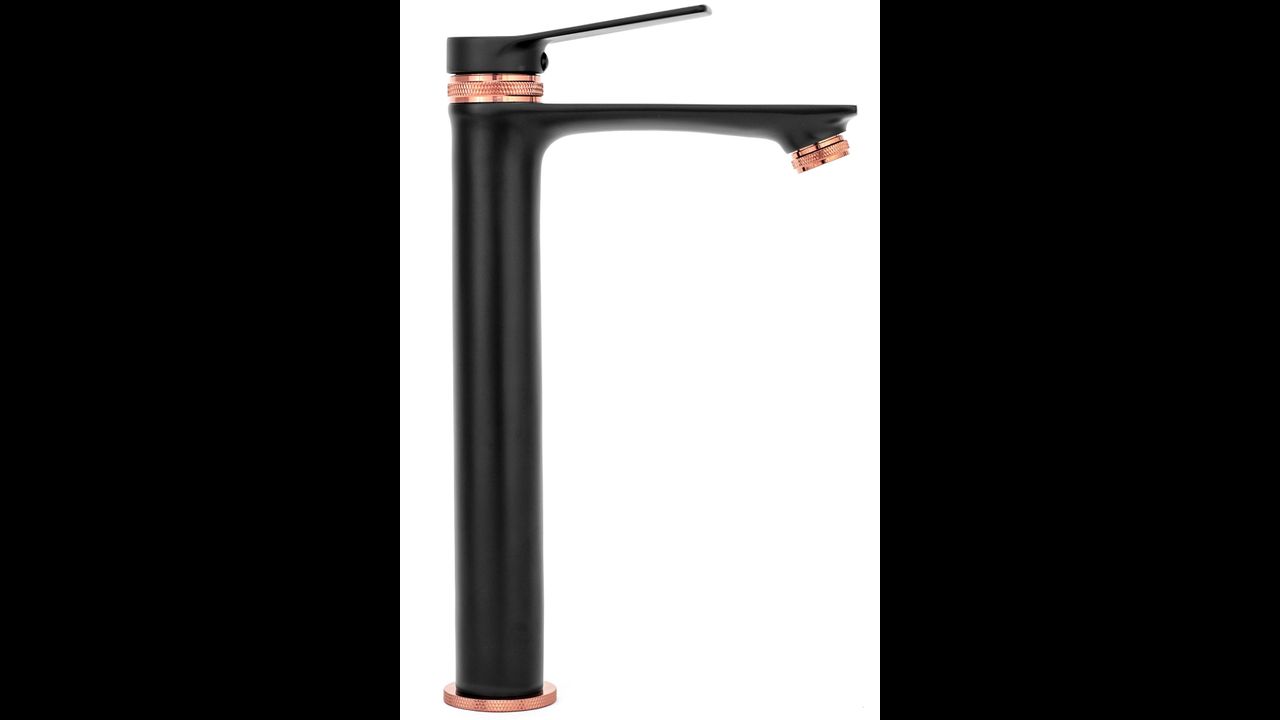 Moderná vysoká umývadlová batéria série Rea Viral je vyrobená z vysoko kvalitnej mosadze s úpravou v čiernom matnom prevedení s ružovo zlatými doplnkami.