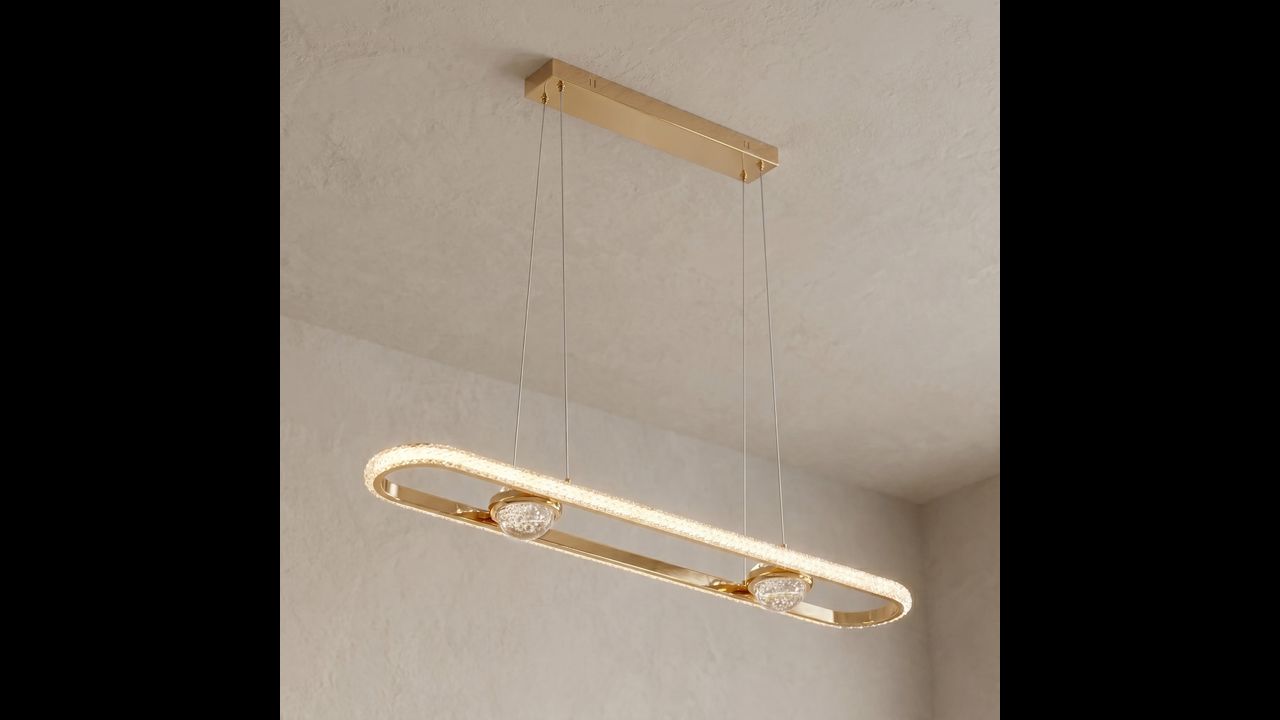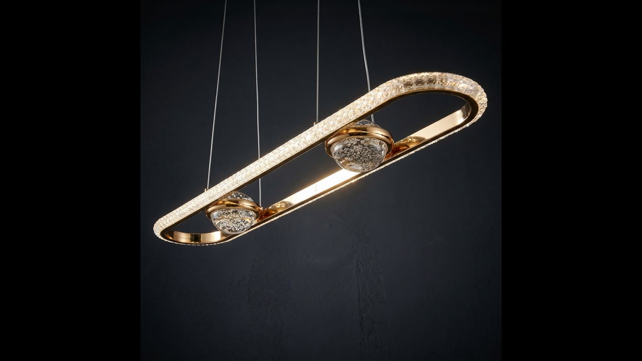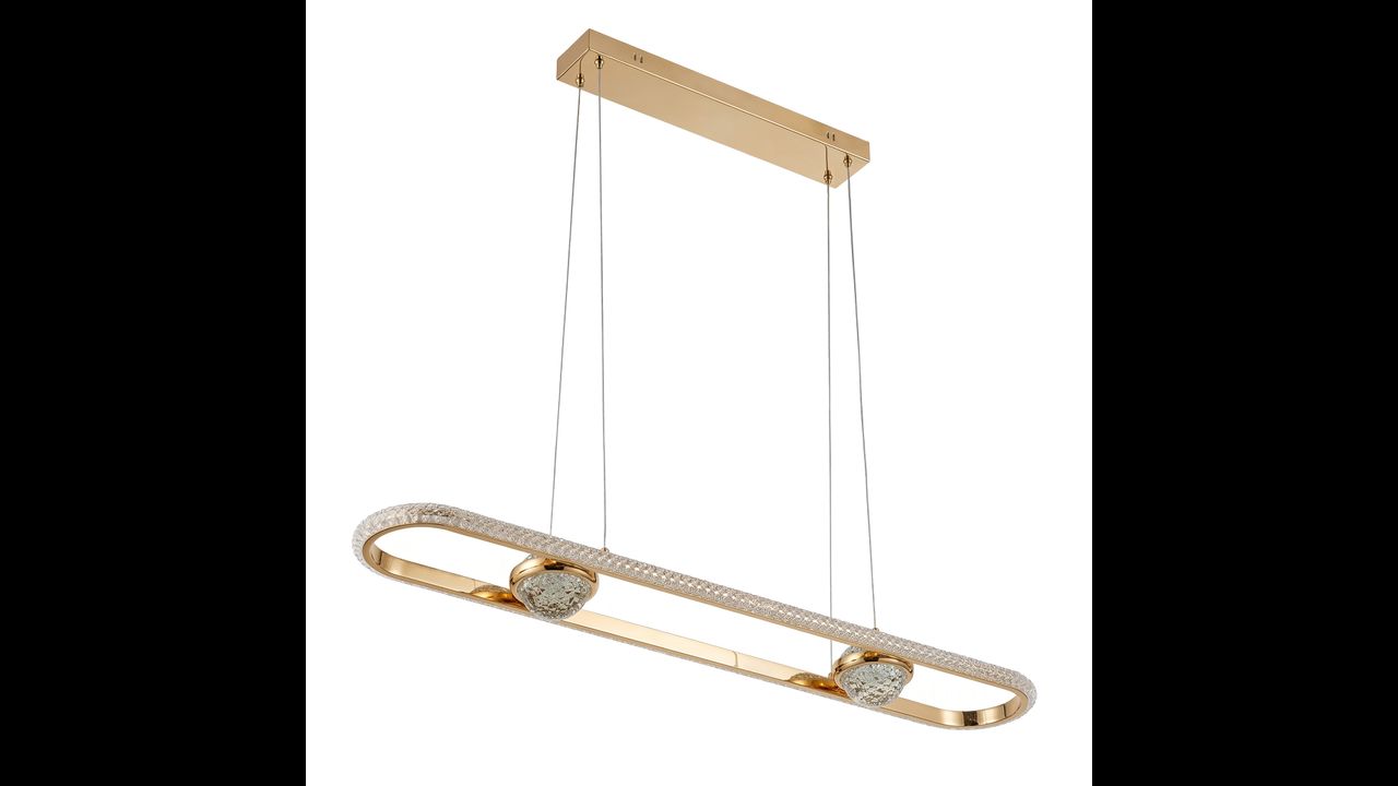 Moderné LED závesné stropné svietidlo vo forme podlhovastého prstenca je elegantné osvetlenie, ktoré sa vynikajúco hodí nad stôl alebo kuchynský ostrov. Jeho štíhla, horizontálna forma dodáva interiéru ľahkosť a zlatá povrchová úprava v lesku podčiarkuje luxusný charakter aranžmánu.